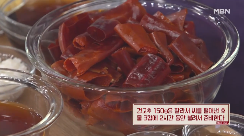 3. 건고추 150g을 잘게 자르고 씨를 제거한 후, 물 3컵에 2시간 동안 불려주세요. 불린 고추 물은 절대로 버리지 않도록 주의해 주세요.