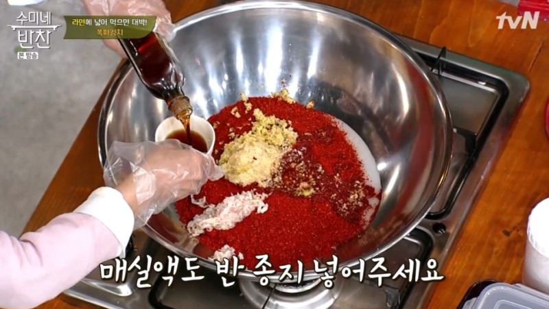 재료 : 찹쌀풀, 고춧가루, 다진 마늘, 생강, 다진 새우젓, 멸치액젓 10큰술, 간장 10큰술, 매실액 10큰술, 설탕 1큰술, 물 2종지