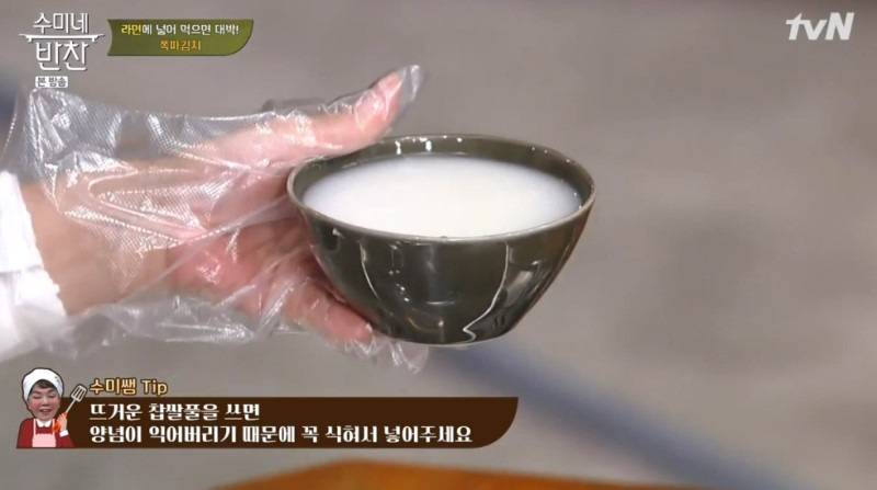 1. 찹쌀 풀 300g을 미리 쑨 후 식혀서 큰 볼에 담아 주세요.
