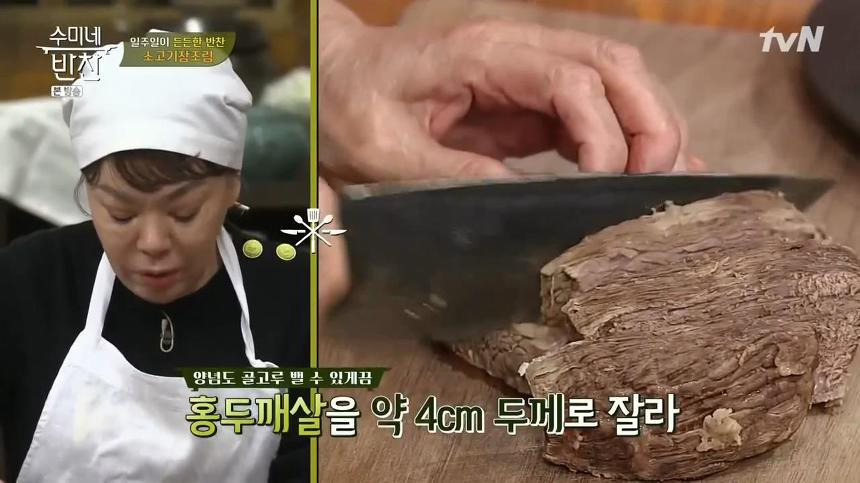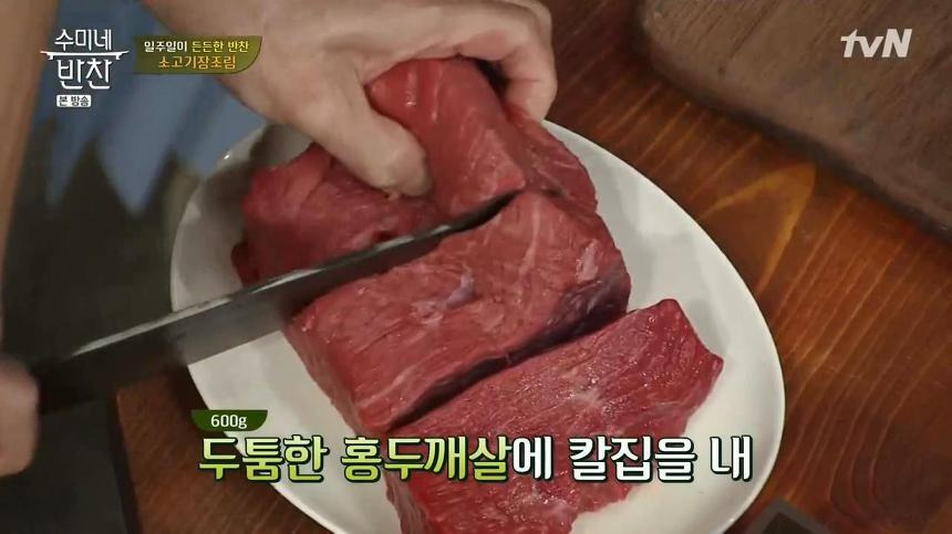 3. 삶은 홍두깨살은 결대로 썰어주시면 되는데요, 양념이 고루 배일 수 있도록 약 4cm 두께로 잘라주세요.