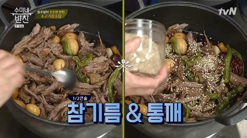 15. 찢은 고기에 양념이 잘 스며들도록 한 번 더 끓여준 후, 마지막으로 참기름 1/2큰술과 통깨를 뿌리면 소고기 장조림을 부드럽고 맛있게 만드는 황금 레시피가 완성됩니다.
