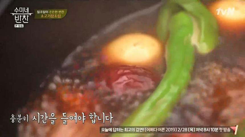 11. 이때 불은 약한 불로 조절하여 식재료 본연의 맛이 잘 우러나도록 충분히 시간을 두는 것이 좋습니다. 이렇게 하면 꽈리고추에도 장조림 양념이 배어 더 맛있게 된다고 해요.