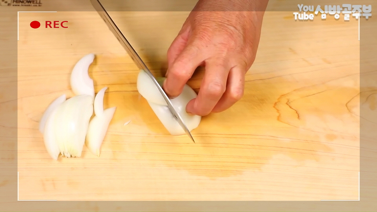 양파를 얇게 슬라이스해서 준비해 주세요. 이렇게 하면 낙지볶음에 자연스러운 단맛이 더해지고, 전체적인 맛이 한층 깔끔해집니다.