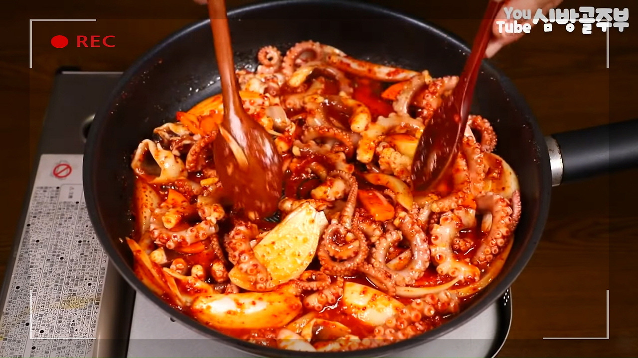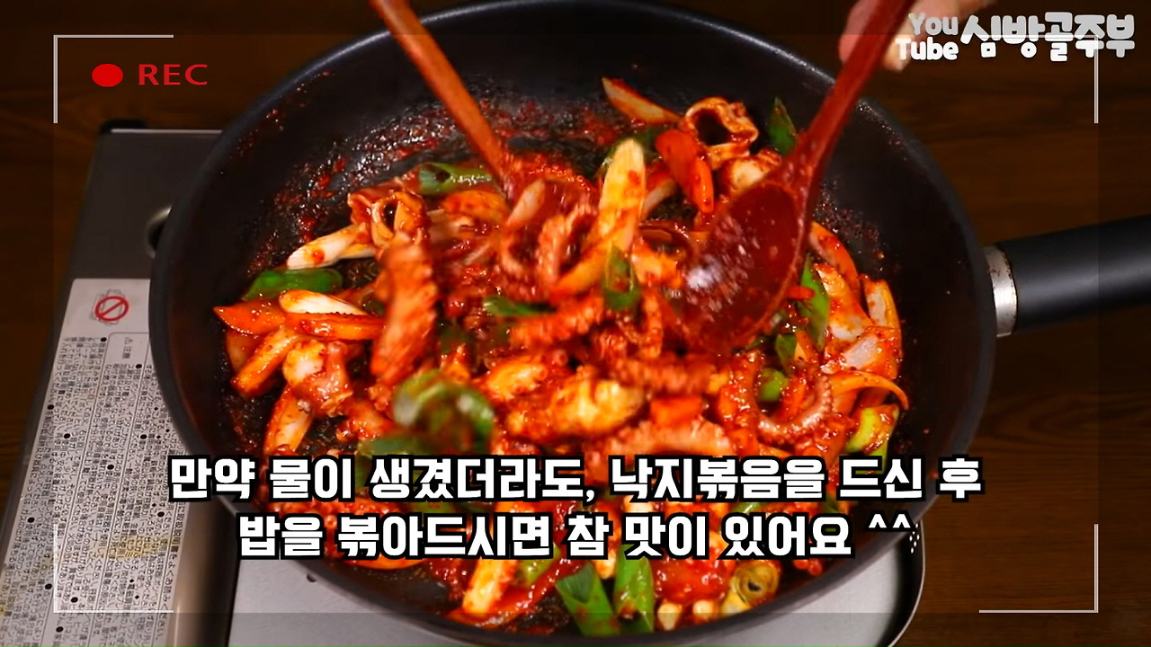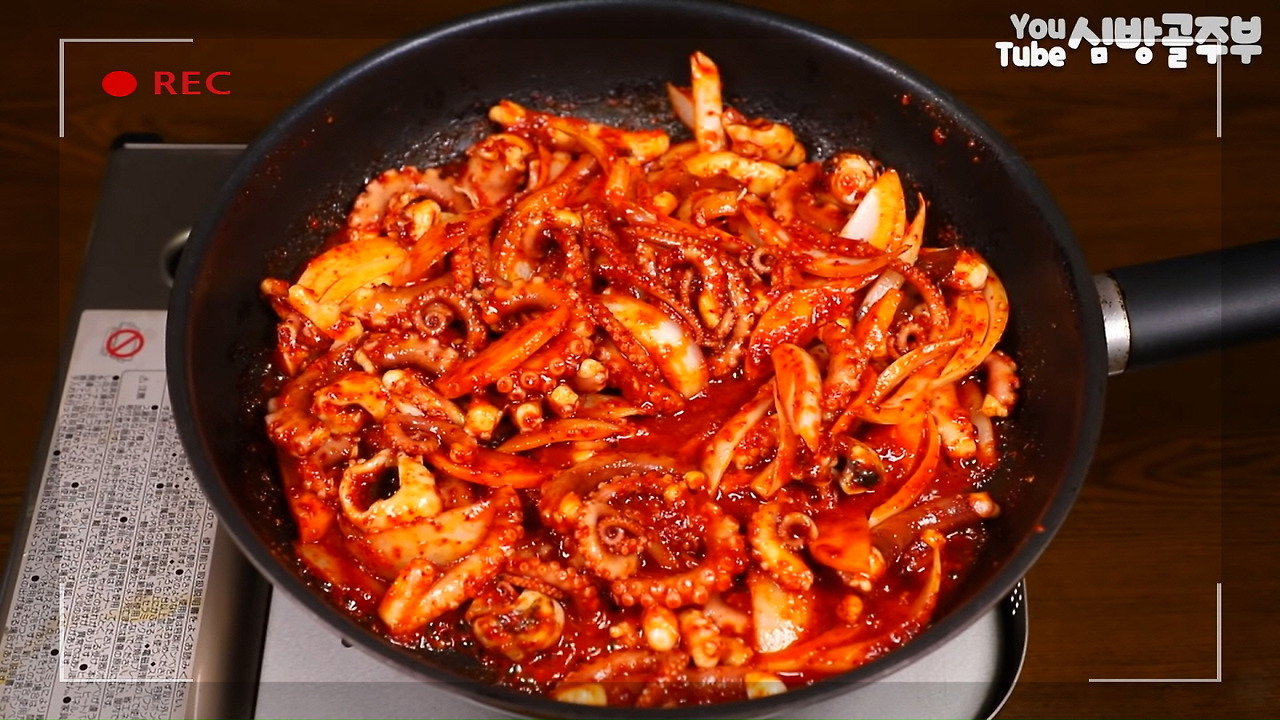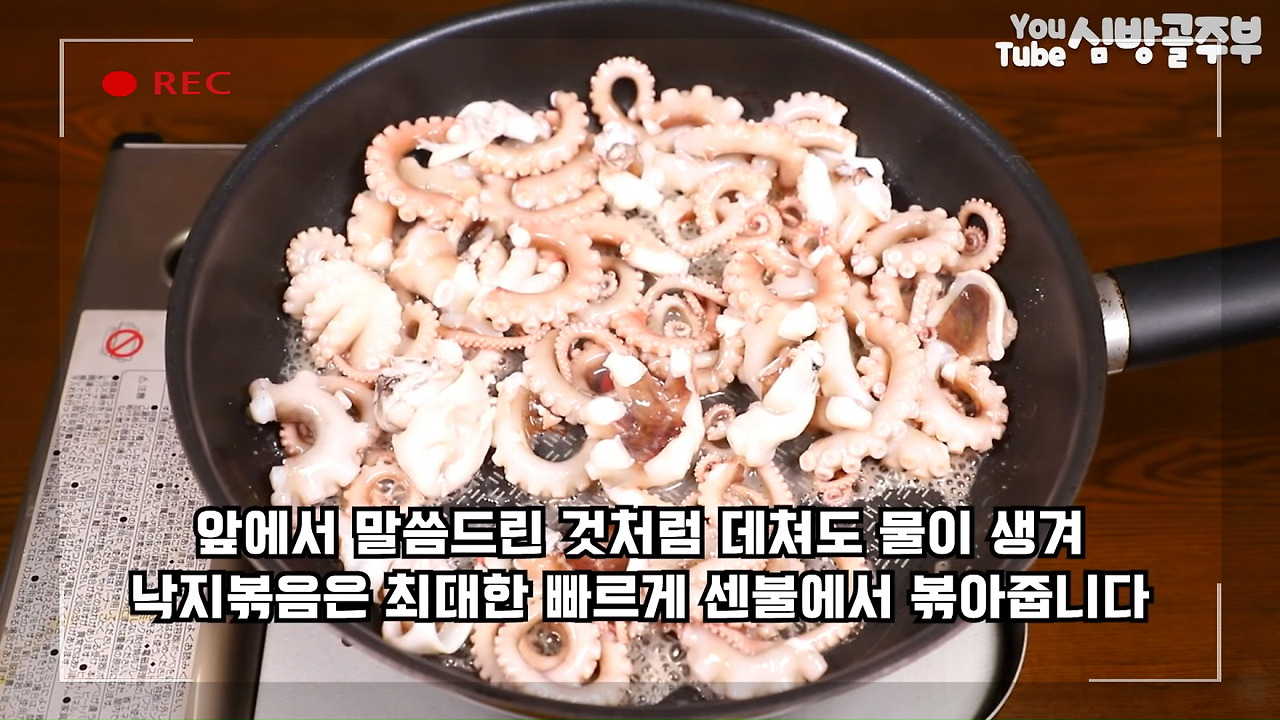 낙지볶음은 조리 과정에서 수분이 많이 생기는 요리입니다. 깔끔한 맛을 내기 위해서는 센 불에서 빠르게 볶아야 불필요한 물이 많이 생기지 않고 맛있게 완성할 수 있습니다.