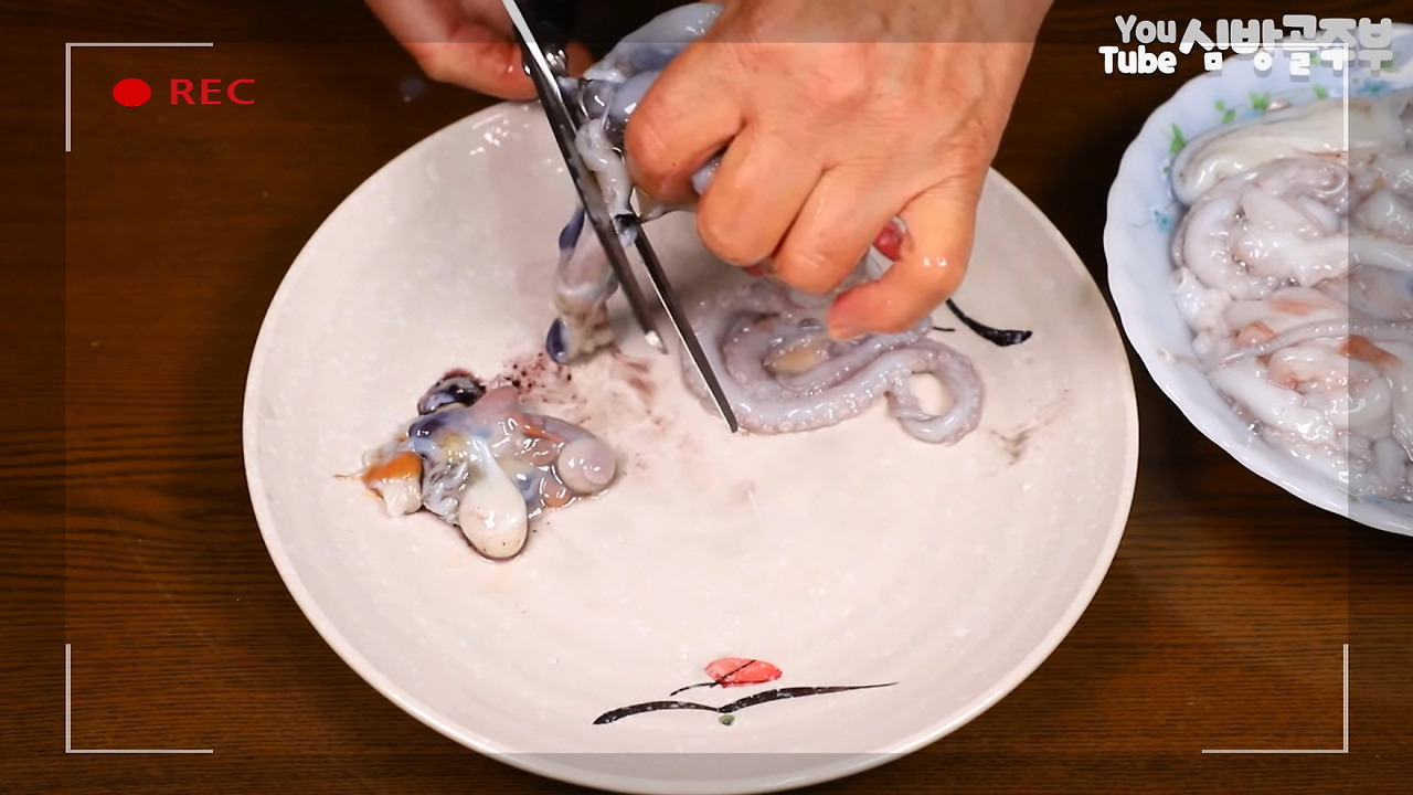 마지막으로 낙지의 이빨을 제거한 뒤 가위로 잘라주면 손질이 완전히 마무리됩니다.