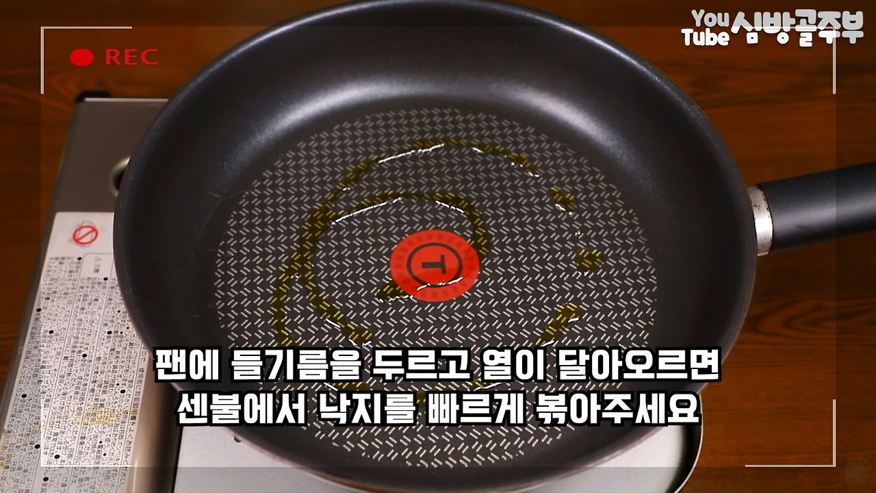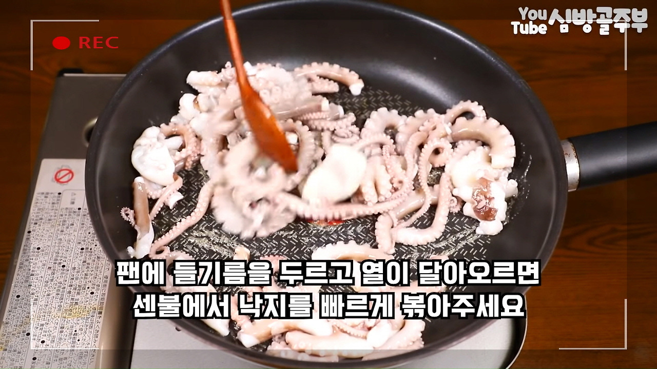 팬에 들기름을 두른 후 충분히 달궈지면, 센 불에서 낙지를 빠르게 볶아 주세요.