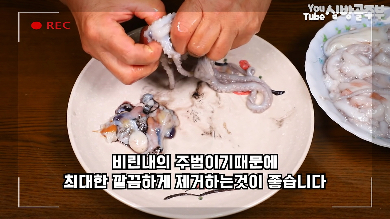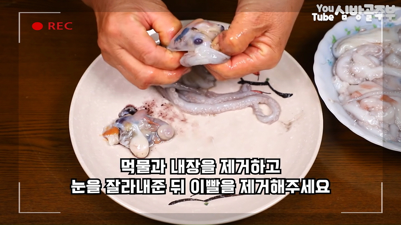 머리를 뒤집은 상태에서 가위를 사용해 내장과 먹물을 잘라내면 더욱 쉽게 제거할 수 있습니다.