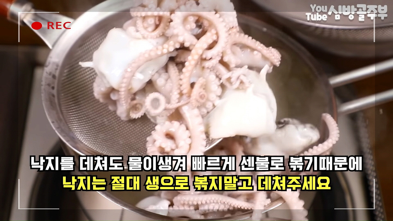 낙지를 볶을 때 수분이 많이 생기므로, 끓는 물에 약 20초 정도 살짝 데쳐준 후 사용하면 더욱 깔끔한 맛을 낼 수 있습니다.