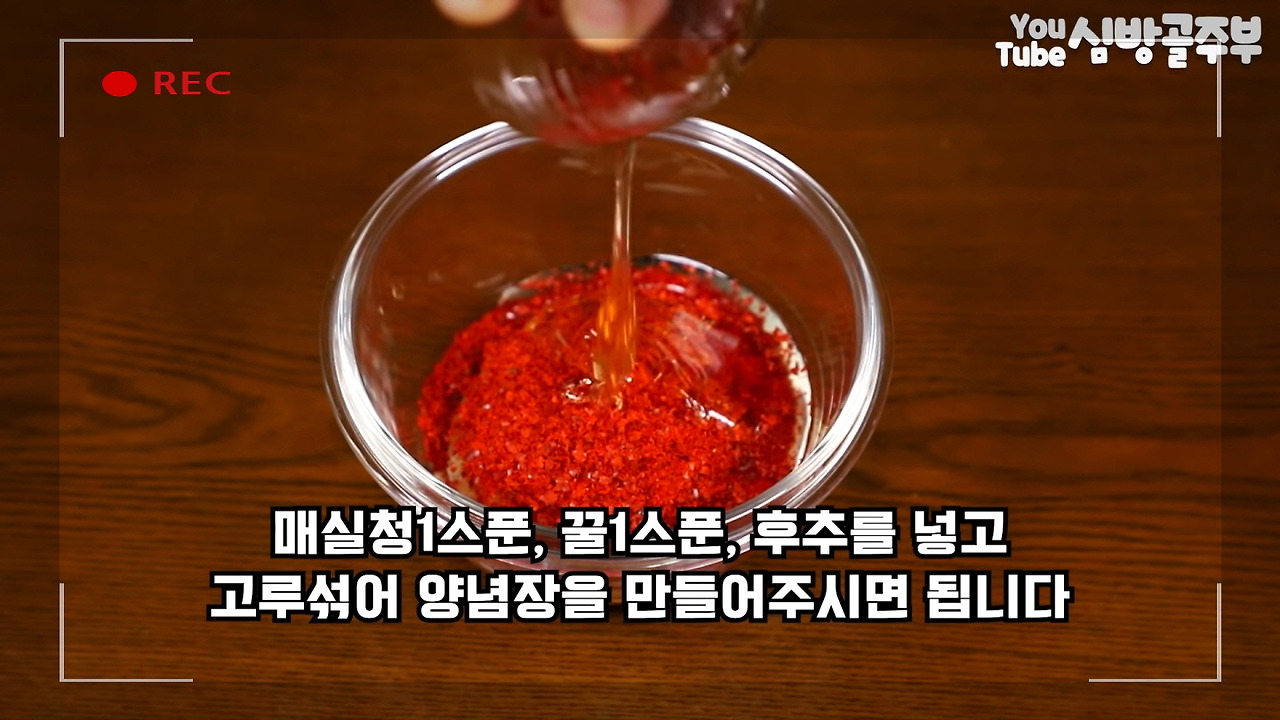 매실청 1큰술, 꿀 1큰술, 후추를 모두 넣고 잘 섞어 양념장을 만들어 주세요.
