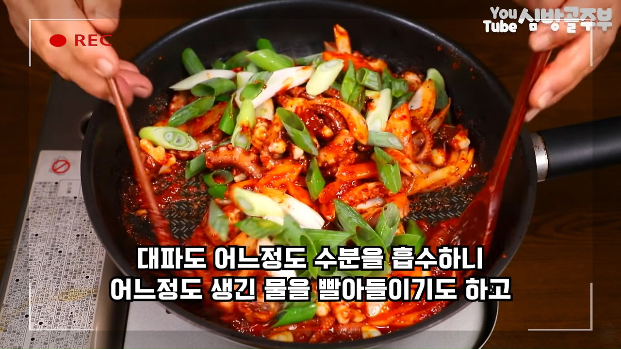 약간의 수분이 생긴 낙지볶음에 대파를 넣어주면, 대파가 수분을 어느 정도 흡수해 주면서 남아 있을 수 있는 잡내와 비린내까지 깔끔하게 제거해 줍니다.