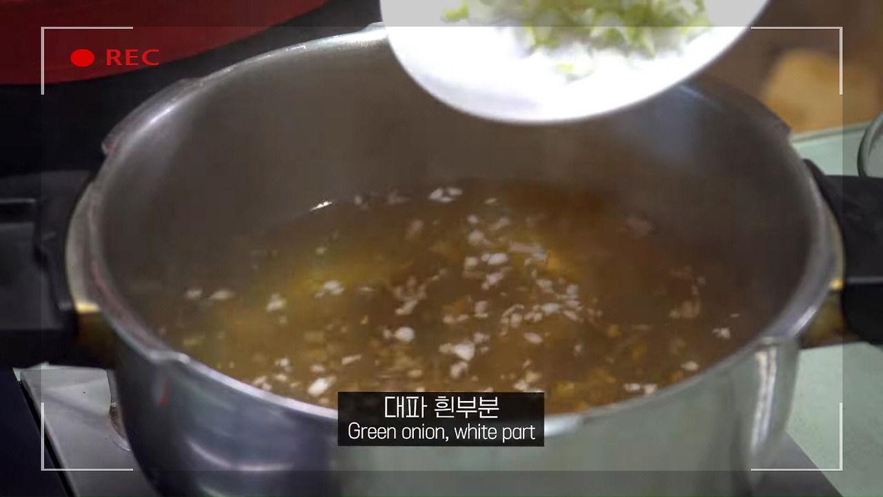 그다음 멸치액젓 한 스푼과 대파 흰 부분을 넣어 감칠맛과 깔끔한 맛을 더해주면, 매생이 굴국의 국물 맛을 내는 과정이 마무리됩니다.