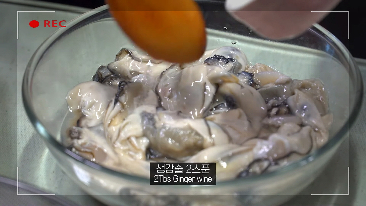 이제 본격적으로 매생이 굴국을 끓이는 단계입니다. 먼저 굴에 생강청 두 스푼(또는 소주, 청주)을 넣고 가볍게 비벼주면, 남아 있던 비린내가 제거되어 국물이 한층 깔끔해집니다. 그런 다음, 국물에 매생이를 조금씩 잘 풀어 넣어줍니다.