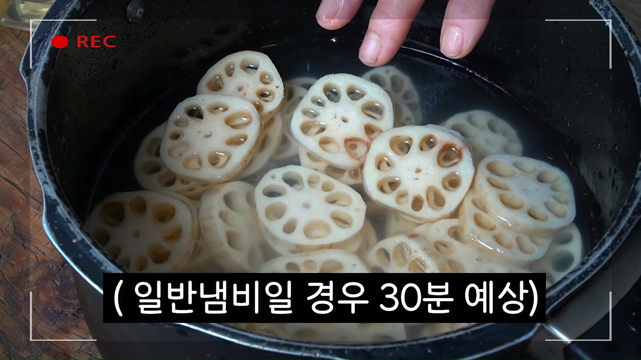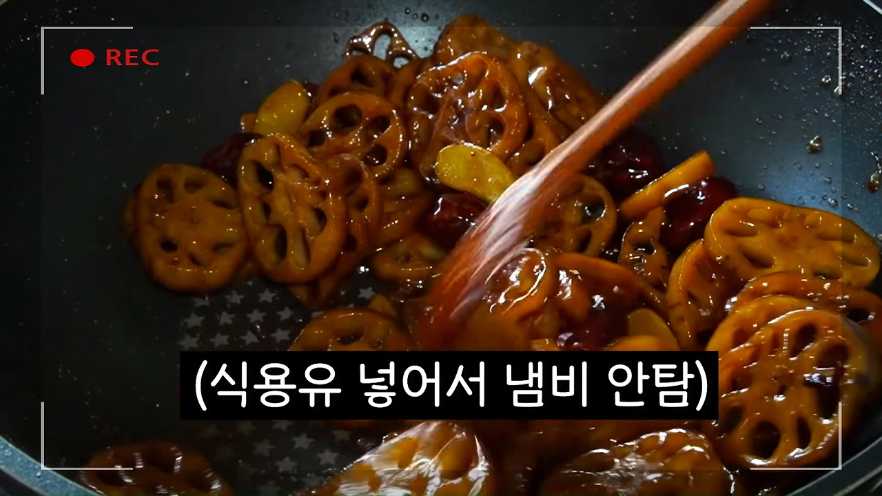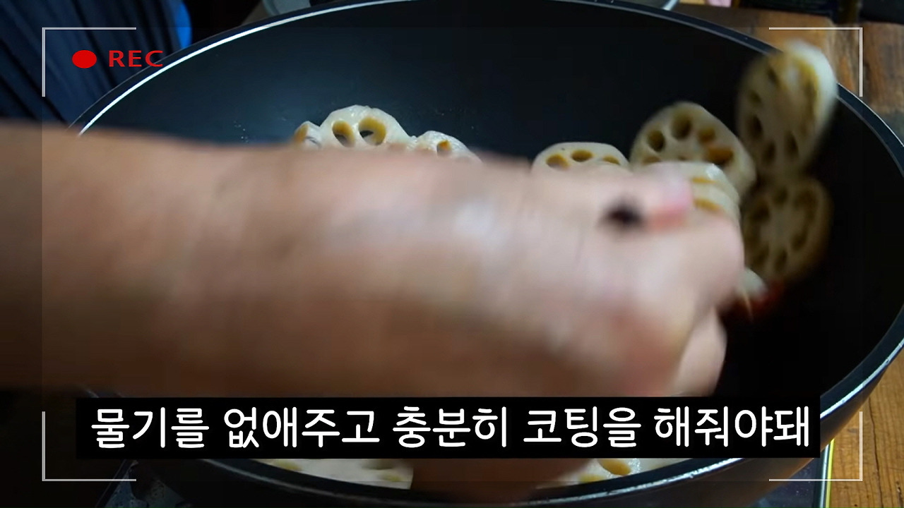 약 2~3분 동안 연근을 식용유에 볶아주면서 수분을 날리고, 연근이 기름에 충분히 코팅될 수 있도록 해주세요.
