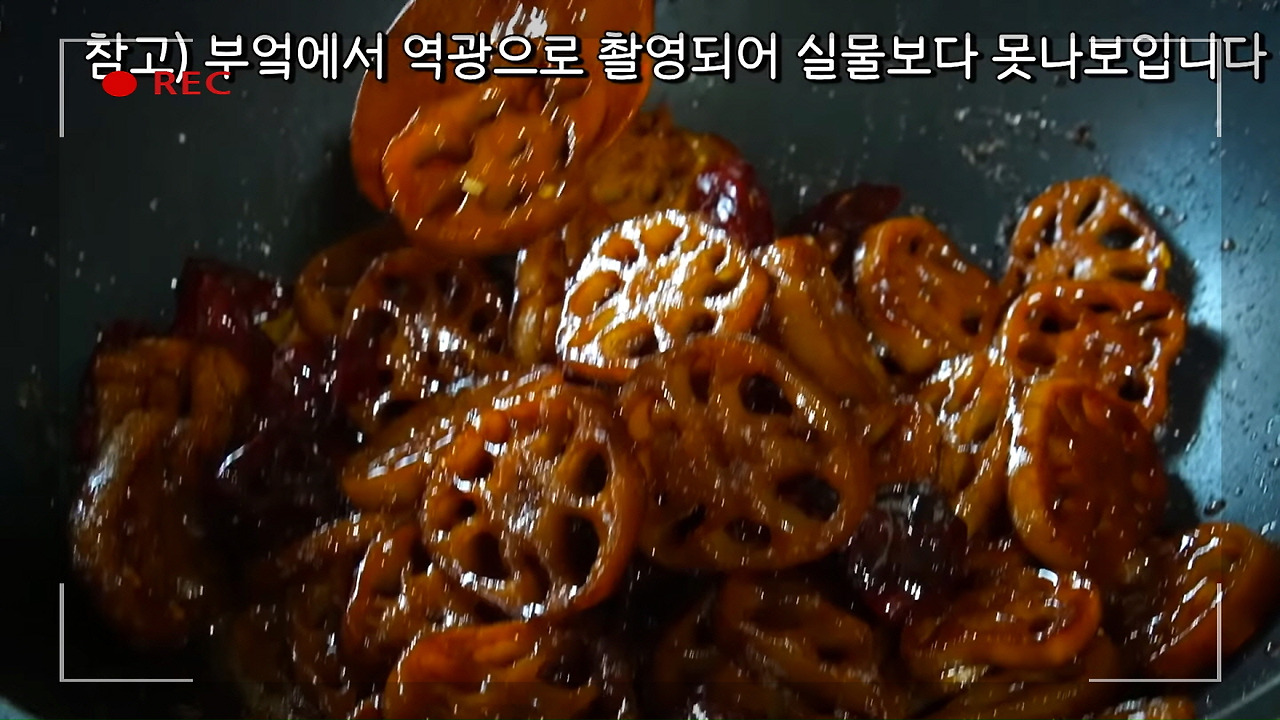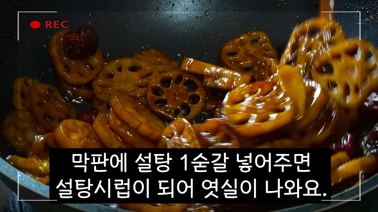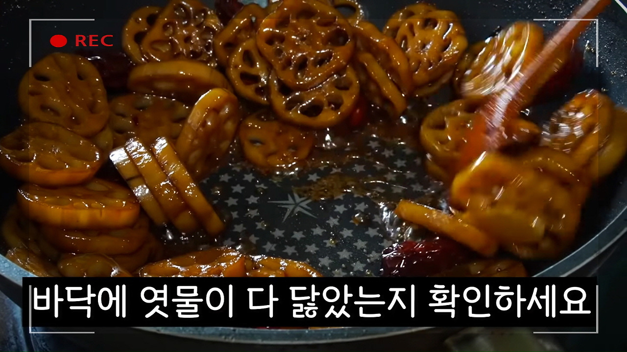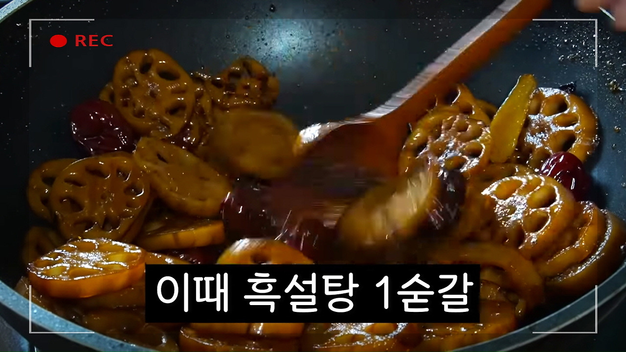 사진을 자세히 보면, 흑설탕을 넣은 덕분에 생긴 ‘엿실’이 가득한 모습을 확인할 수 있습니다. 이 과정 덕분에 연근조림이 식어도 윤기와 쫀득한 식감을 그대로 유지할 수 있는 것이죠.