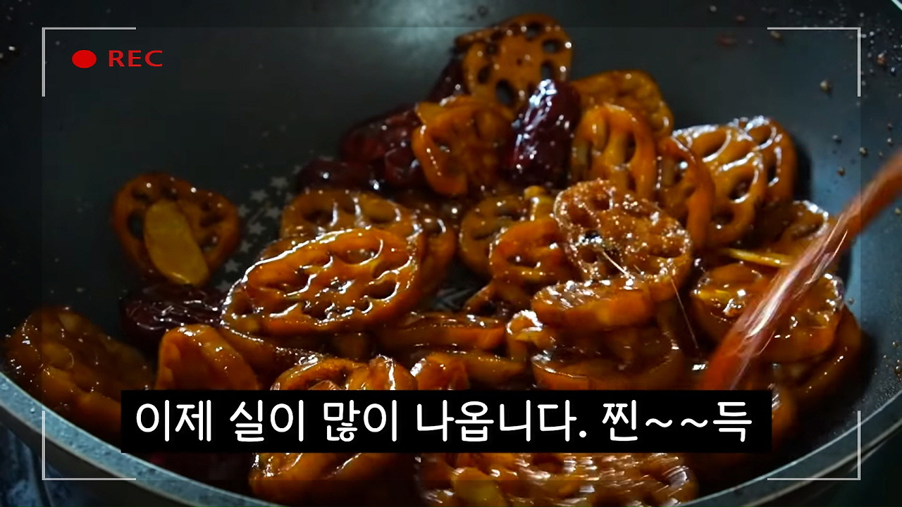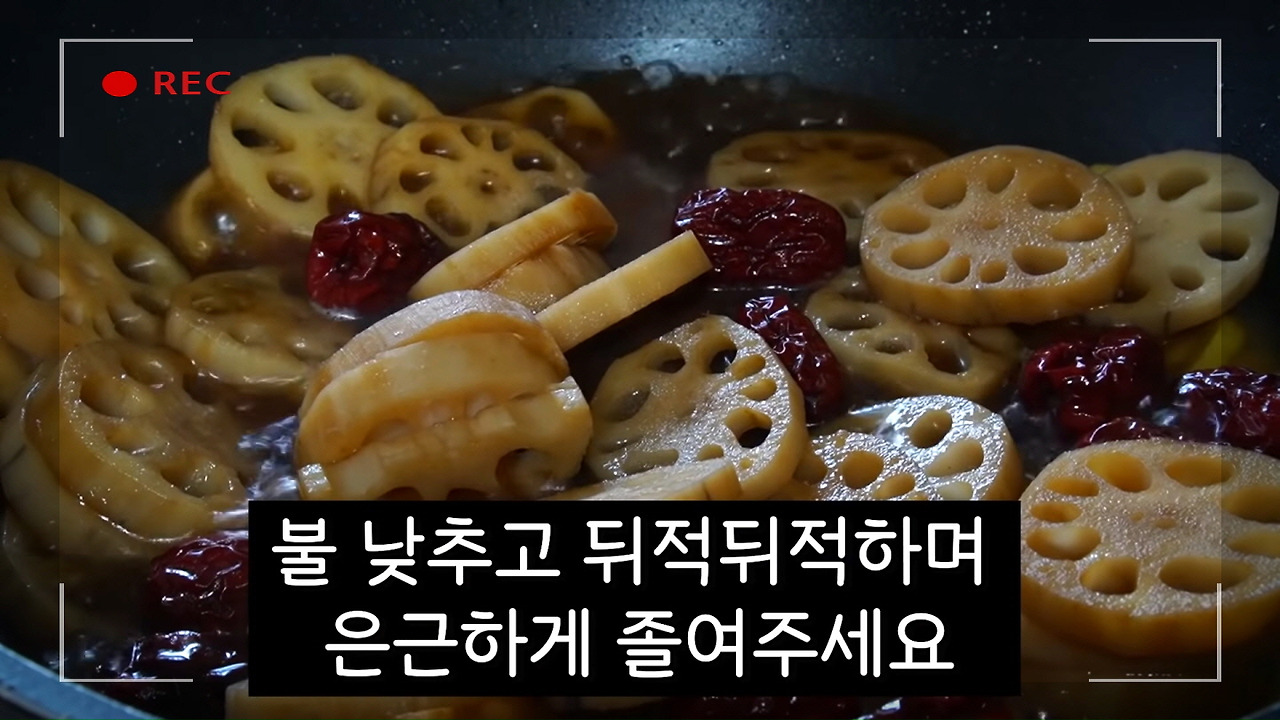 국물이 완전히 졸아들고 엿실이 생겨 윤기가 돌면, 연근조림이 완성된 것입니다.