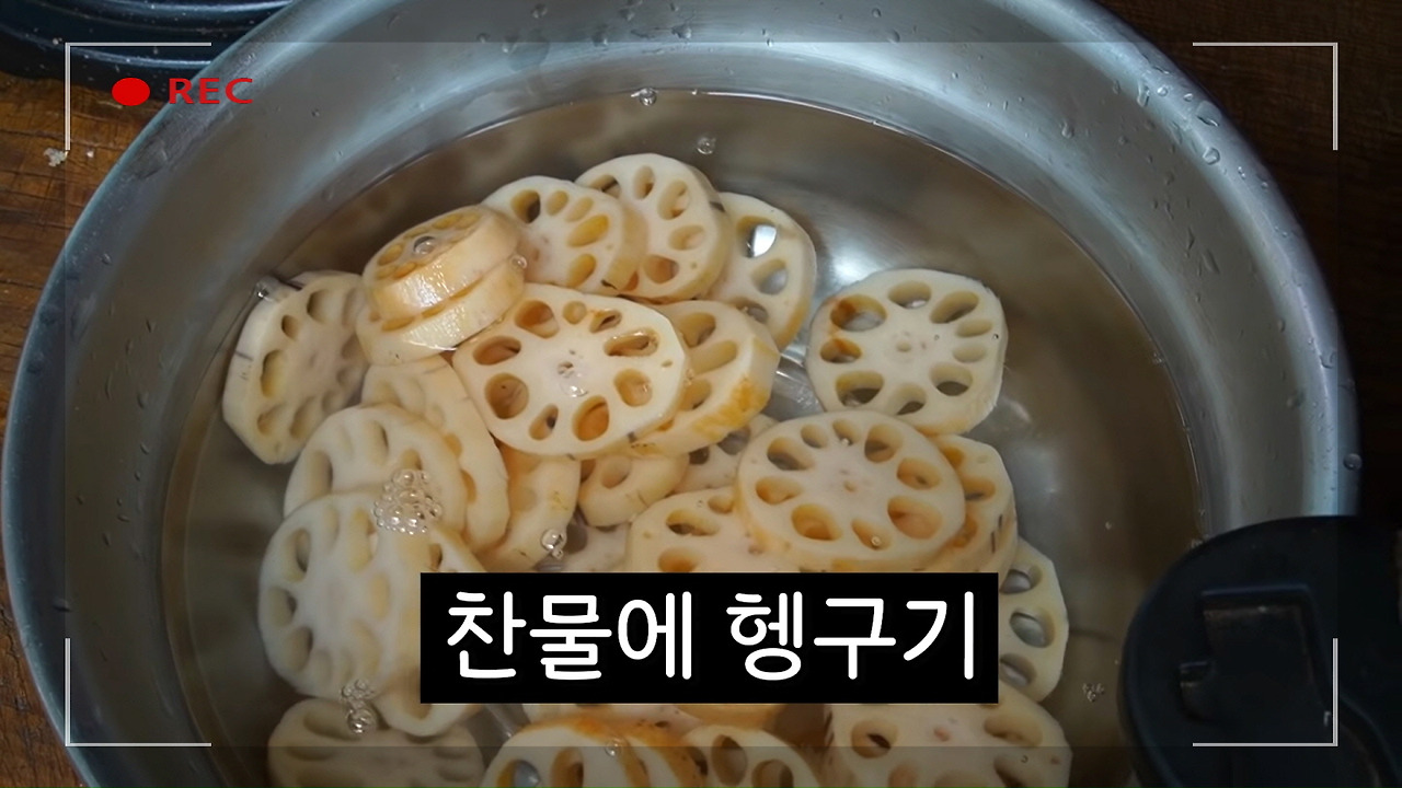 삶은 연근은 찬물에 넣어 충분히 헹궈주세요.