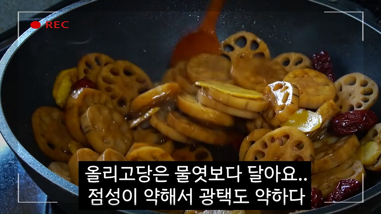 연근조림을 만들 때, 올리고당은 물엿보다 점성이 약하고 단맛이 강하기 때문에, 적당한 단맛과 윤기 있는 질감을 원한다면 물엿을 사용하는 것이 좋습니다. 조릴 때는 센 불이 아니라 중약불에서 천천히 졸여주세요.