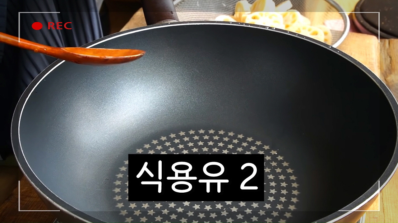 이제 본격적으로 연근조림을 만들어볼까요? 먼저, 예열된 팬에 식용유 두 스푼을 넣고 연근을 볶아주세요.