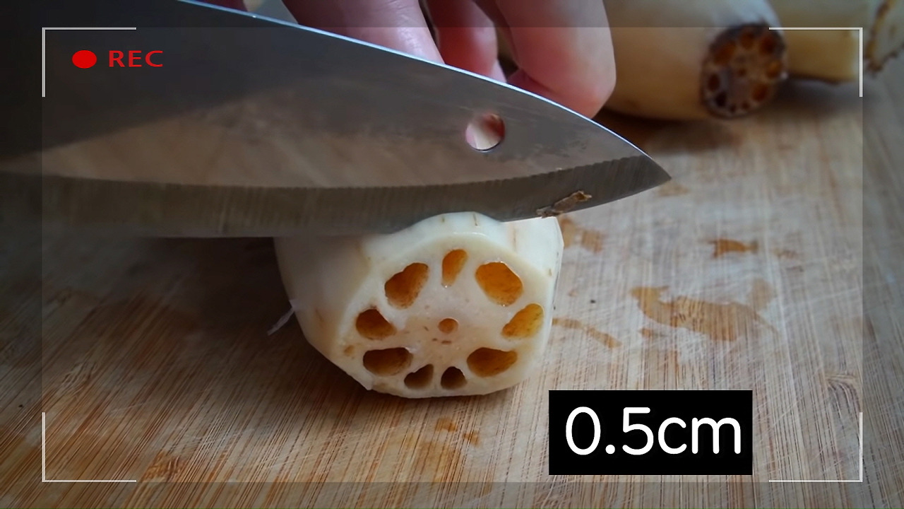 힘을 주어 두드릴 필요 없이 부드럽게 잡고, 연근을 약 0.5cm 두께로 균일하게 썰어주세요.