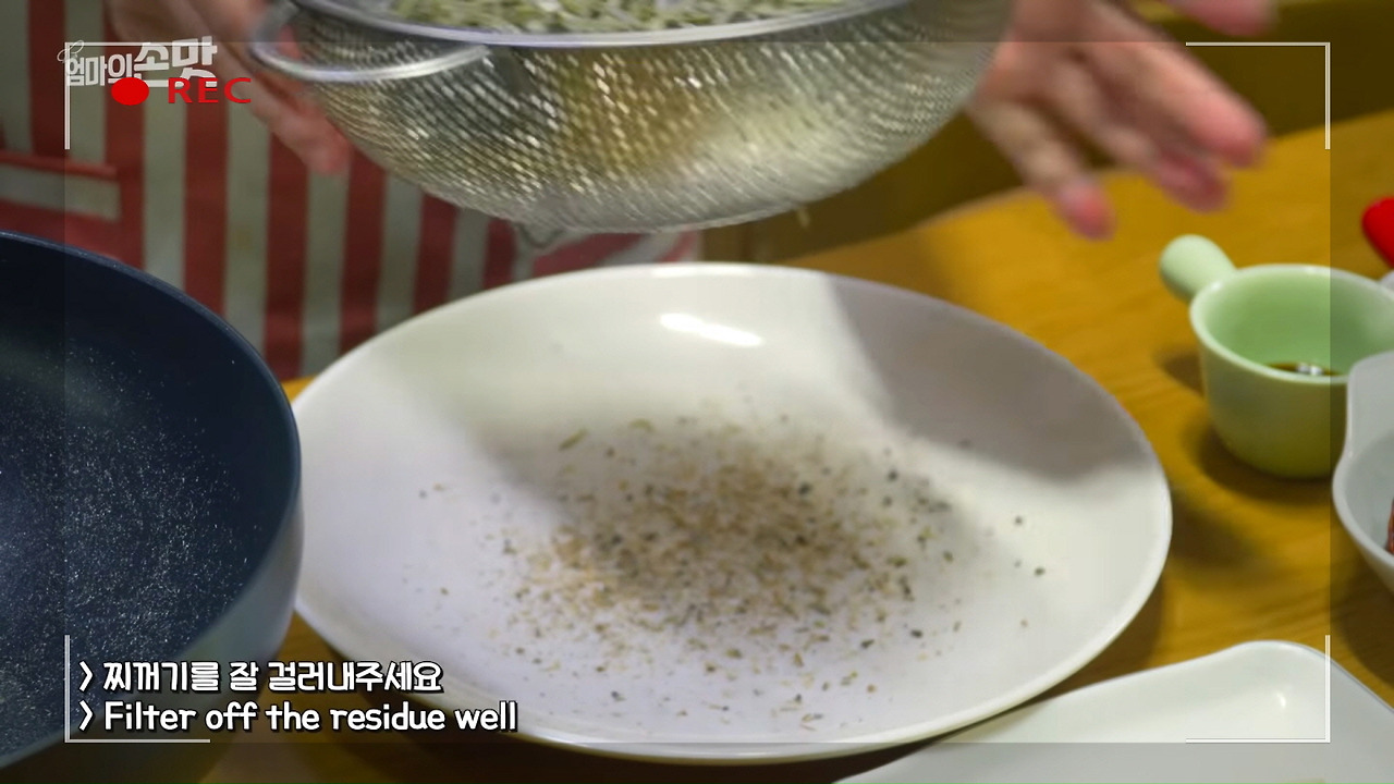 그다음 멸치를 채로 걸러서 볶을 때 생긴 찌꺼기를 잘 걸러주면, 더욱 맛있고 깔끔한 멸치볶음이 완성됩니다.