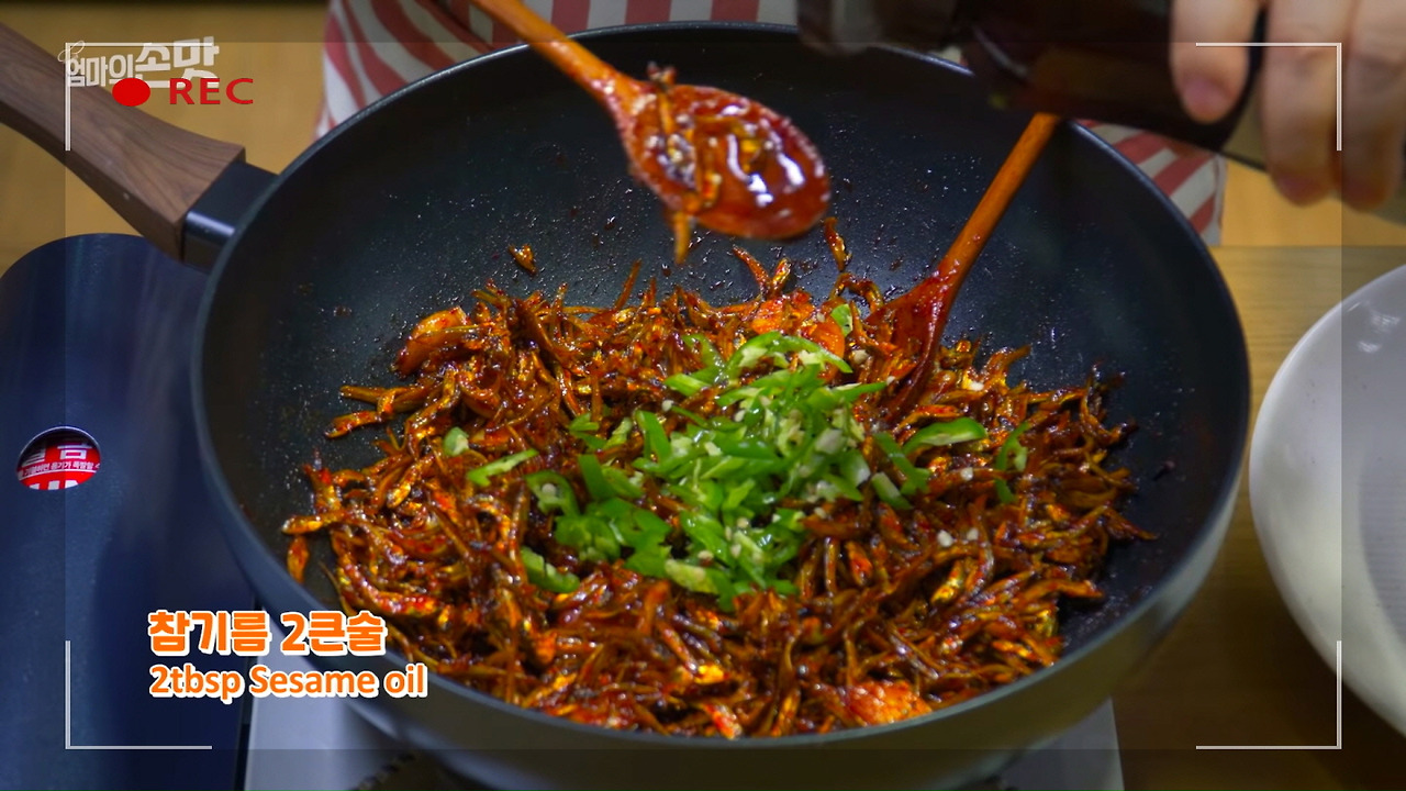 참기름 2큰술도 추가로 넣어 멸치볶음에 고소한 맛을 더해주세요.