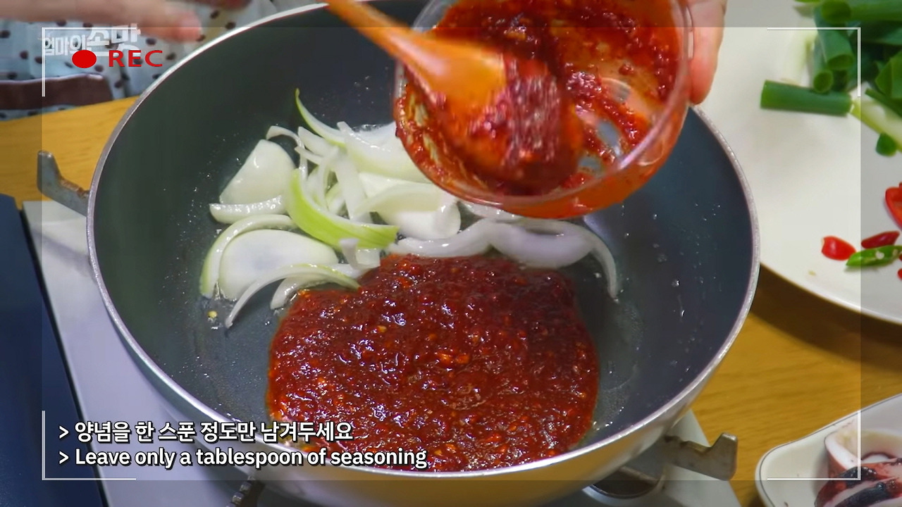 양파를 볶으면서 팬 반대편에 식용유와 양념장을 잘 섞어가며 함께 볶아주세요. 이때 양념장은 한 큰술 정도 남겨두시는 게 좋습니다.