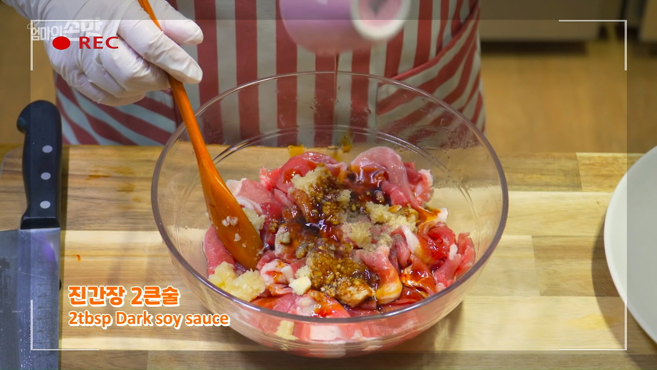 후추와 진간장 2큰술을 넣어주면 제육볶음의 간이 알맞게 맞춰지고, 감칠맛도 한층 살아납니다.