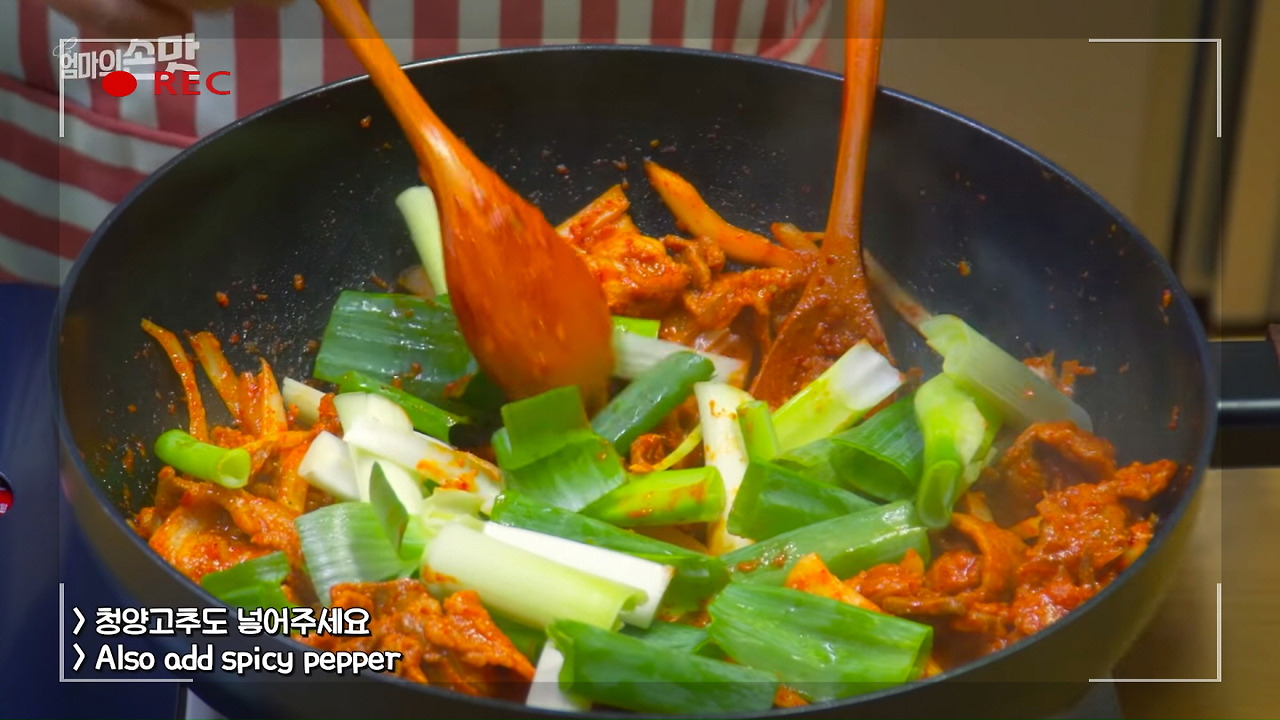 고기가 거의 다 익고 양파의 숨이 죽을 때쯤, 청양고추와 대파를 넣어 잡내와 누린내를 잡아주면 더욱 맛있고 깔끔한 제육볶음이 완성됩니다.