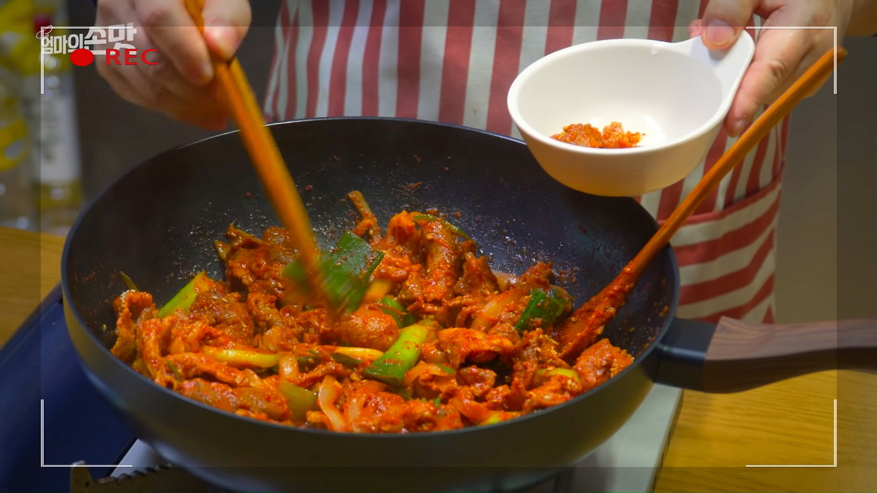 고춧가루 2큰술을 넣어 깔끔하고 칼칼한 맛을 제육볶음에 더해주세요.
