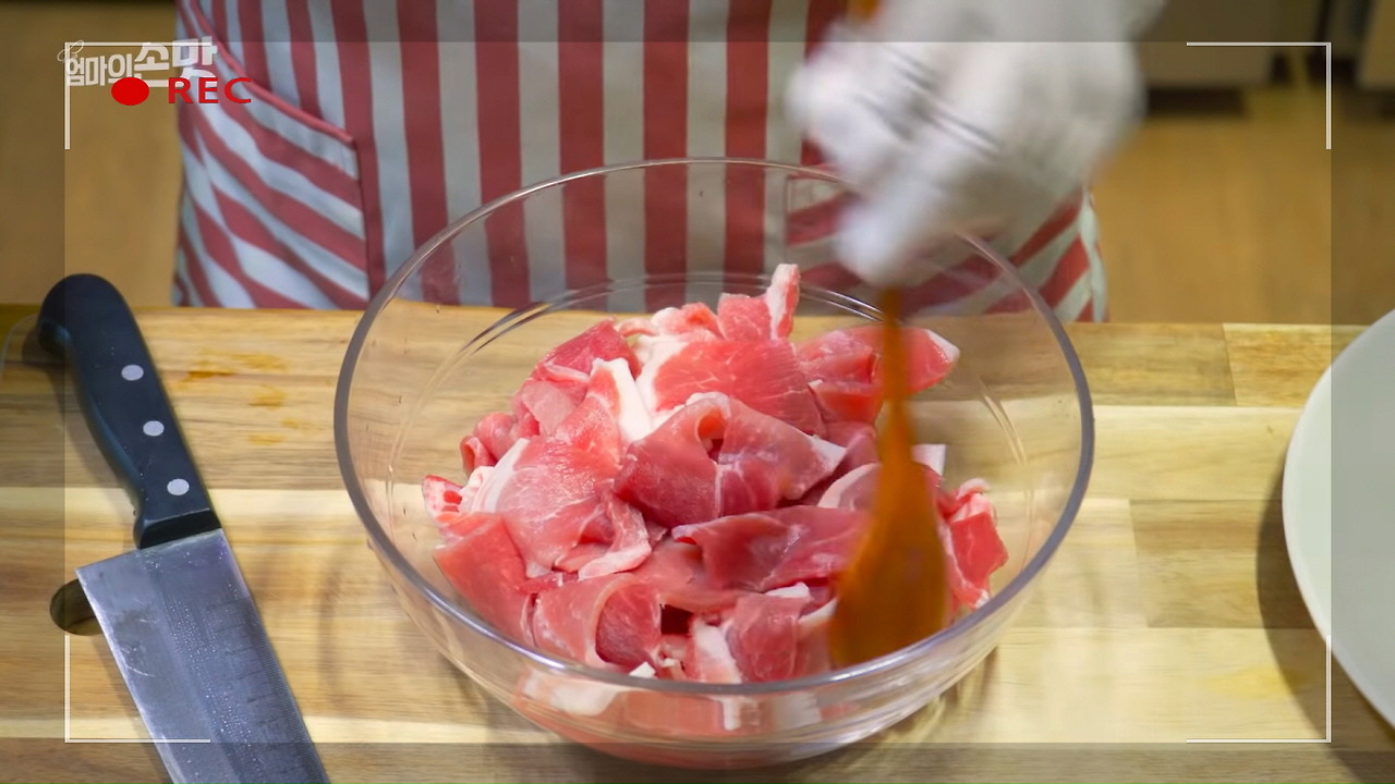 얇게 썬 돼지고기는 양념이 잘 배도록 서로 붙어있지 않게 잘 떼어주세요.