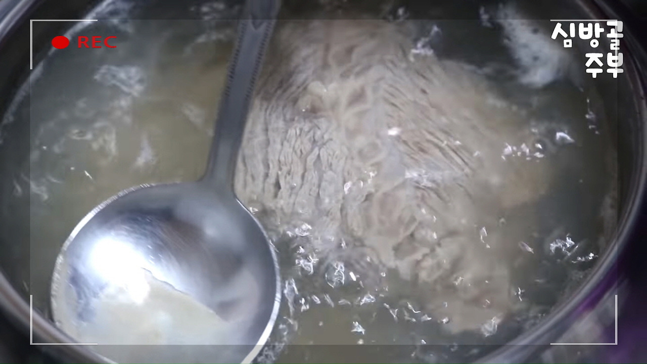 약불로 2시간 동안 삶아준 뒤, 건더기들은 모두 채로 건져냅니다. 육수는 미역국을 끓일 때 활용할 것입니다.