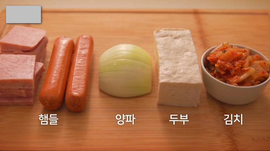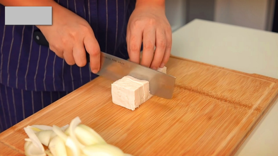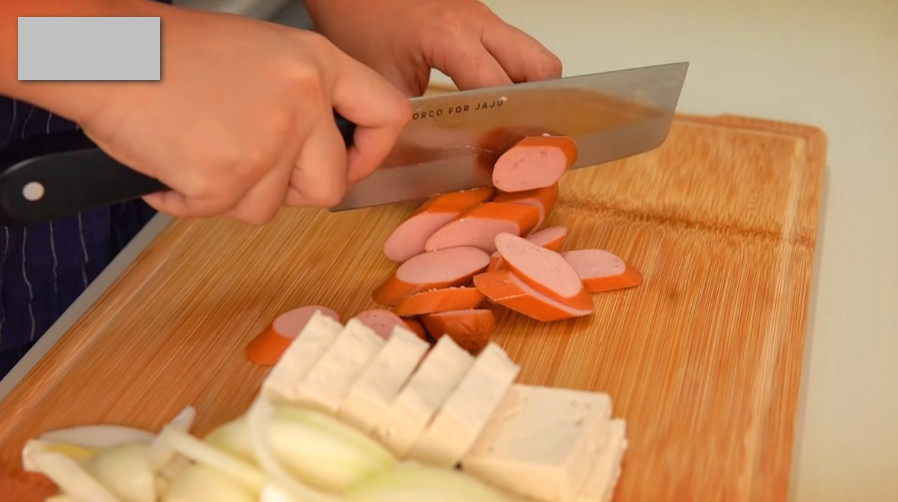두부는 먹기 좋은 크기로 썰어주시고, 대파 반 개와 소시지는 어슷하게 썰어주세요. 양파는 슬라이스로 썰어 부대찌개에 은은한 단맛이 퍼질 수 있도록 준비해주시기 바랍니다.