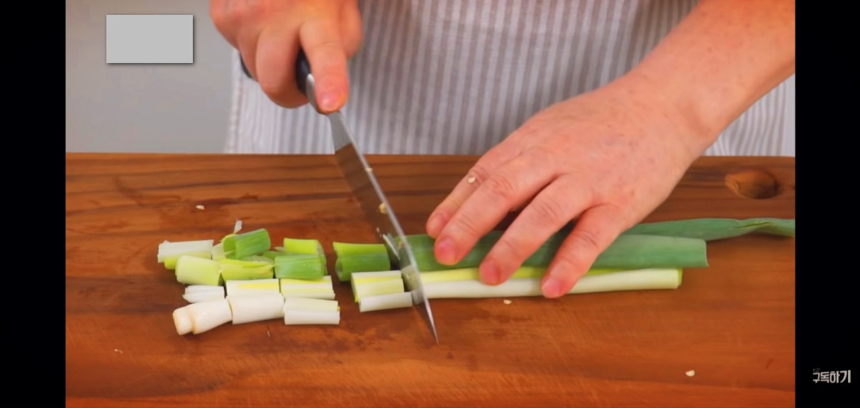 홍고추 2개도 비슷한 크기로 썰어 주세요. 색감이 좋아서 고등어 무조림이 더 먹음직스러워져요. 대파도 적당한 크기로 썰어서, 고등어 무조림에 남아있는 잡내를 잡아줍니다.