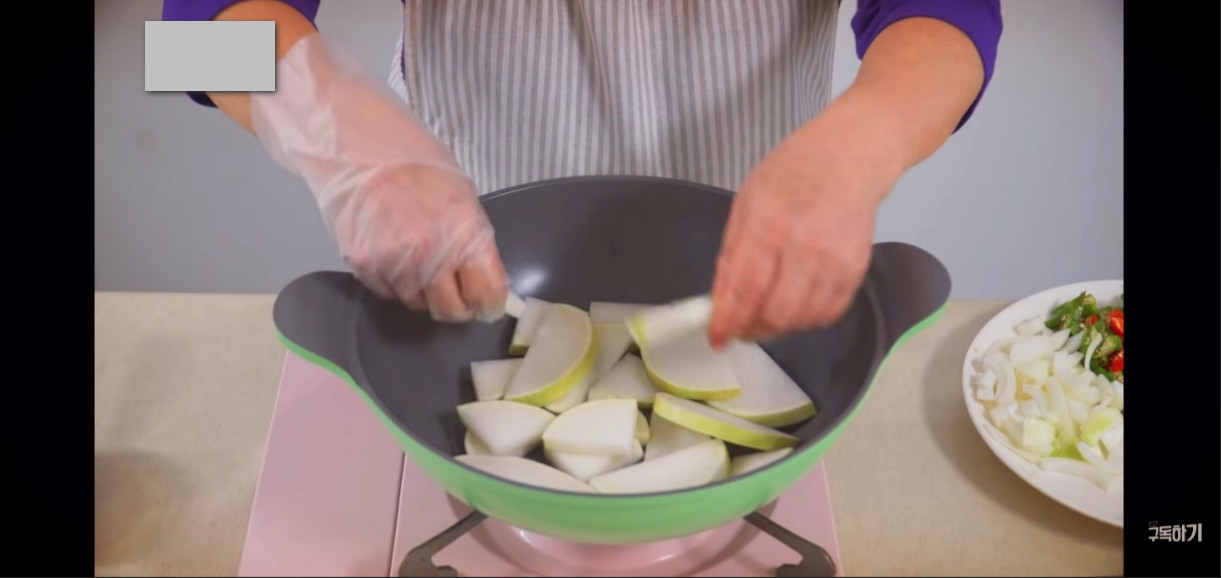 먼저 무를 냄비 바닥에 깔아서 고등어가 눌러붙거나 타지 않도록 해 주세요. 그 위에 양념장을 올려 무에 양념이 잘 배도록 해 주시면 됩니다.