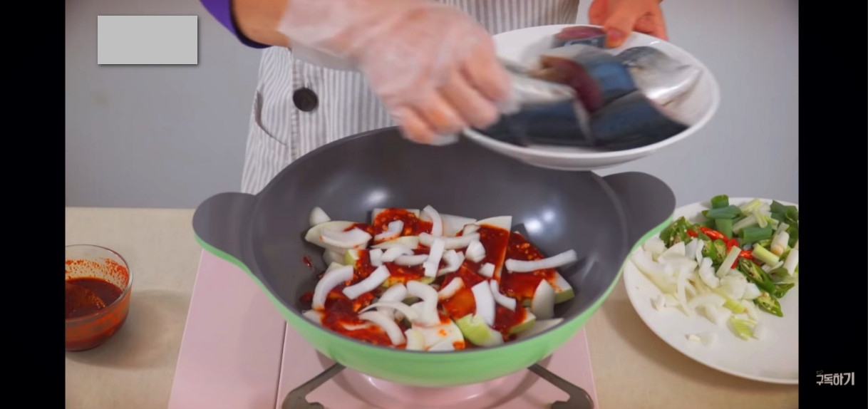 무 위에 양파 반 개를 올리고, 그 위에 고등어를 놓아 주세요. 그 후 남은 양파를 올려 주시면 됩니다.