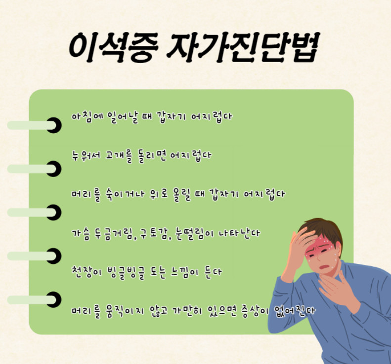 이석증의 증상은 주로 아침에 잠자리에서 일어날 때 갑작스럽게 빙빙 도는 현기증과 평형 감각의 이상이 발작적으로 나타나며, 머리를 움직일 때마다 1분 이내의 강한 어지럼증이 반복되는 것이 특징입니다.