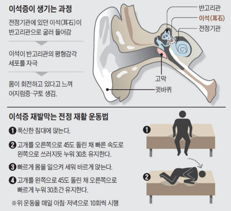 또한 수면 자세도 매우 중요합니다. 수면 중 우측으로 자는 사람은 우측에 이석증이 잘 생기고, 좌측으로 자는 사람은 좌측에 이석증이 잘 생긴다고 합니다. 그래서 이석증 치료 후에는 이석증이 발생한 방향의 반대편으로 자는 것이 도움이 됩니다.
