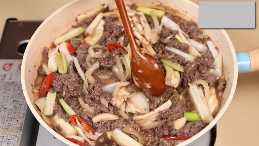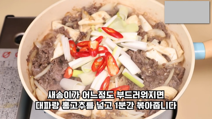 버섯이 부드러워지고 소고기가 거의 다 익어갈 때쯤, 썰어둔 대파와 고추를 넣고 마지막으로 1분 동안 볶아주면 소불고기 황금레시피 완성입니다!