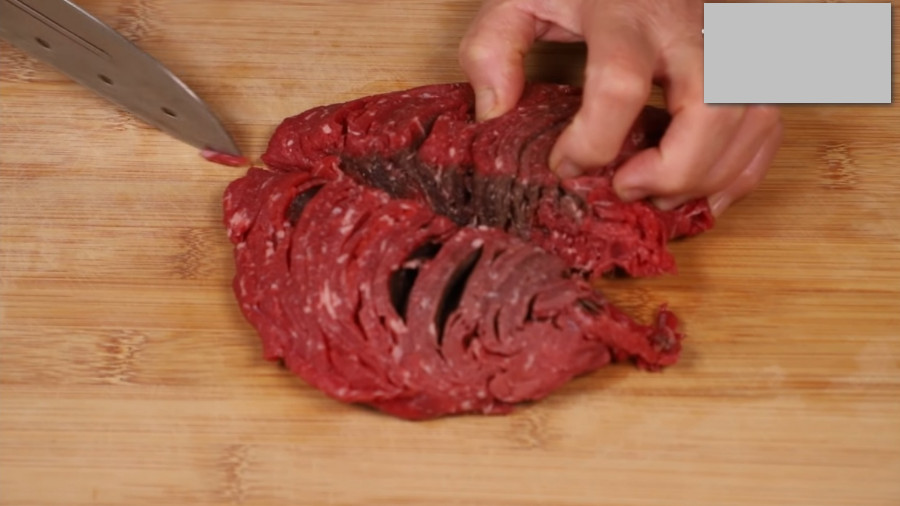 이제 소고기를 먹기 좋은 사이즈로 잘라줍니다. 사진처럼 미리 얇게 썰어져 있는 불고기용 고기를 구입하셨다면, 적당한 길이로 잘라주기만 하면 됩니다.