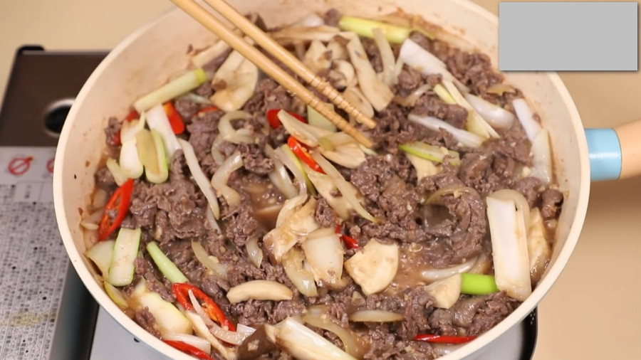 소고기가 어느 정도 익은 게 눈에 보인다면, 썰어둔 버섯을 넣고 약 1분 30초 동안 잘 볶아줍니다.