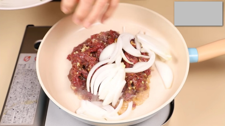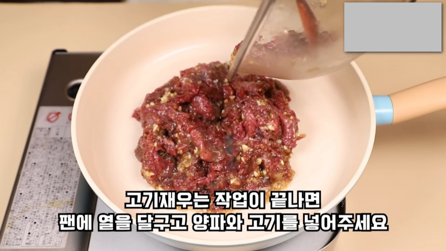 이제 본격적으로 소불고기 황금레시피를 살펴보겠습니다. 중강불로 달군 팬에 소불고기와 양파를 넣고 약 2분 30초 동안 볶아줍니다.