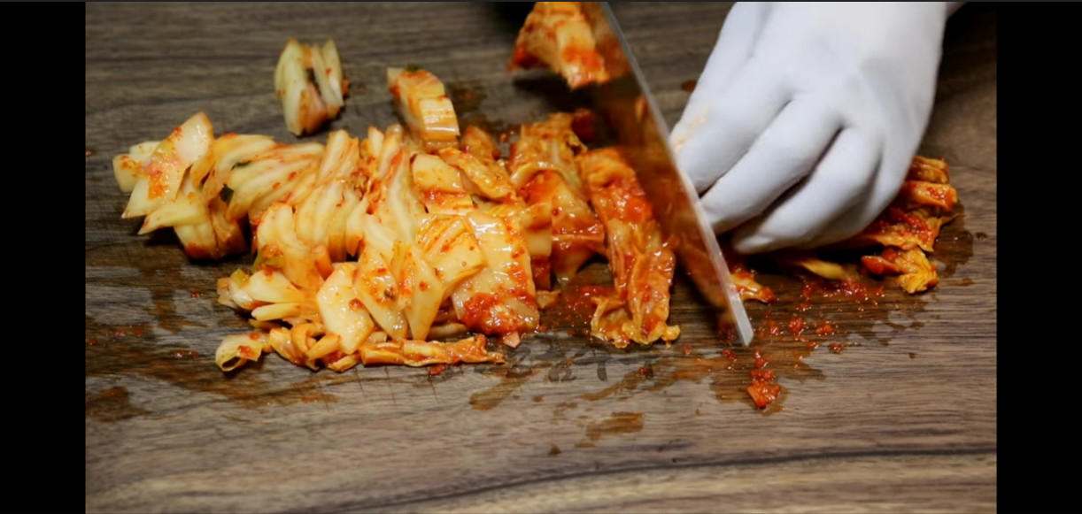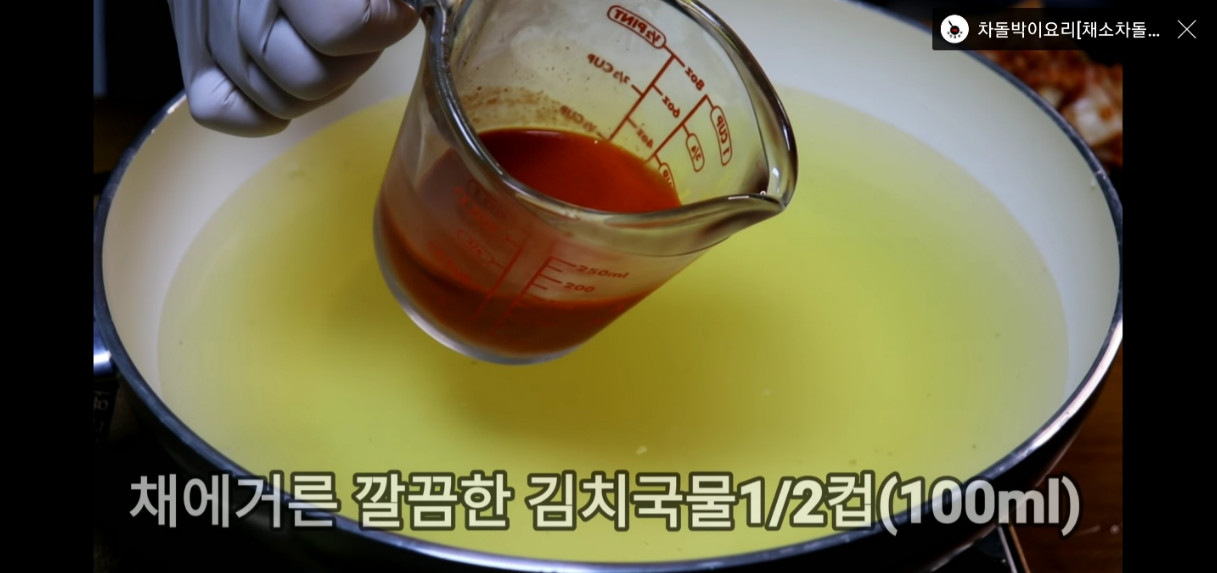 깔끔한 김치국물 반 컵(100ml)도 넣고, 썰어둔 김치도 함께 넣어주세요.