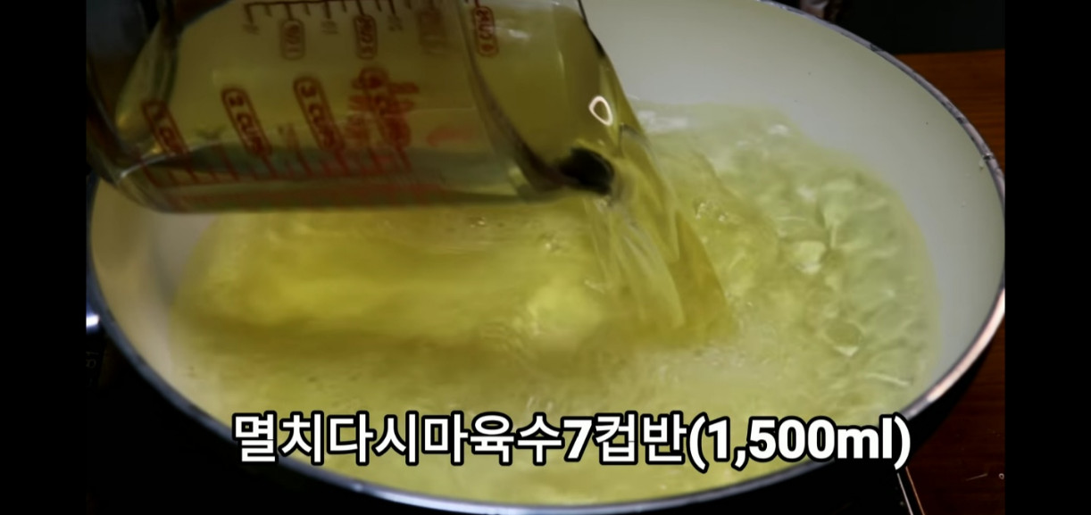 본격적으로 콩나물국 맛있게 끓이는 법을 살펴보기 전에, 먼저 김치를 익혀줍니다. 멸치다시마육수 1.5L를 냄비에 넣고 중불로 올려주세요.