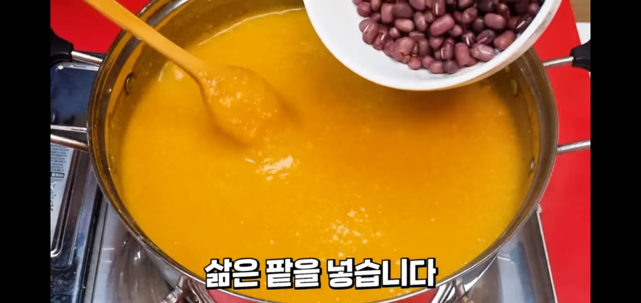 5분 정도는 뚜껑을 덮지 말고, 호박과 찹쌀이 눌러붙지 않도록 계속 저어가며 끓여주세요. 그런 다음, 미리 삶아둔 팥을 넣어주시면 됩니다. 팥을 너무 일찍 넣으면 팥이 터지면서 호박죽 전체가 어두운 색으로 변하니, 중간쯤에 넣어주는 것이 좋습니다!