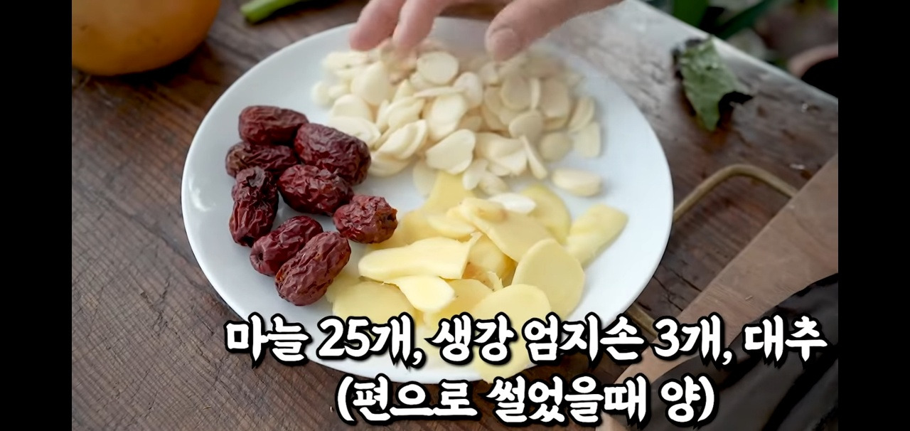 마늘 25알과 엄지손가락 크기의 생강 3개는 잘 우러나도록 편으로 썰어 준비해주시고, 대추 10알은 깨끗이 씻어 준비해 주세요. 이후 썰어둔 생강과 마늘은 우리기 좋은 주머니에 넣어 준비해주시면 됩니다.