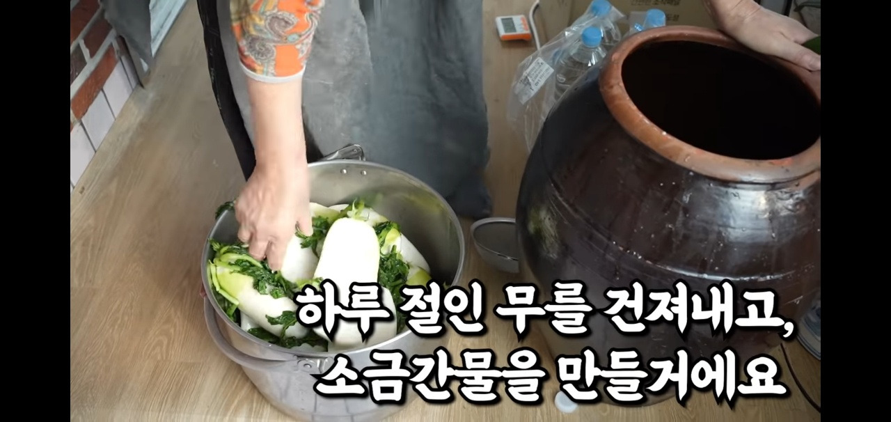 절여진 무에 생수 2L를 부어 짠맛을 어느 정도 헹군 뒤, 다시 장독에 넣어주세요.