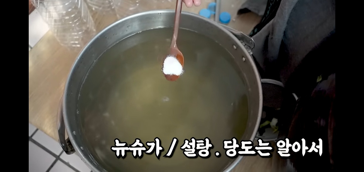 간을 보면서 뉴슈가 또는 설탕으로 당도를 조절해 주세요. 이 상태로 장독에 부어주시면 됩니다. 이제 본격적으로 동치미 맛있게 담는 법을 살펴보겠습니다!