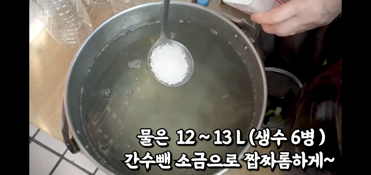 물 12~13L를 부어준 뒤, 굵은소금이나 천일염 두 국자를 넣어 짭짤하게 간을 맞춰주세요.