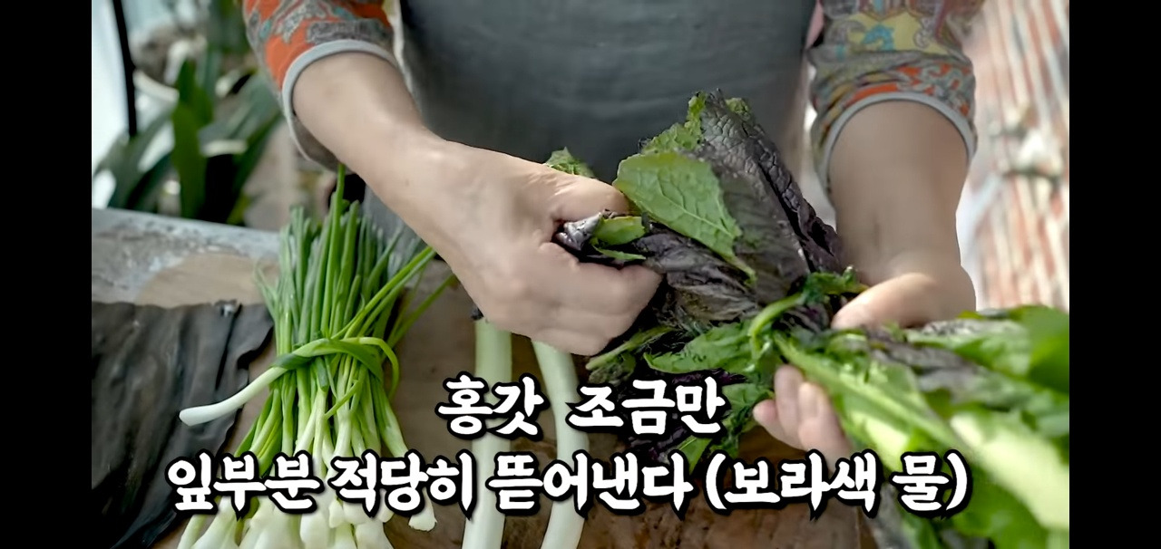 이제 동치미 맛있게 담는 법에 들어갈 재료를 손질해보겠습니다. 홍갓 한 줌에서 보라색 부분을 적당히 뜯어내 주세요.