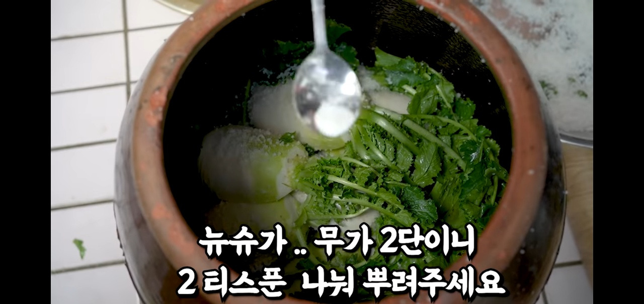 그리고 나서 뉴슈가 한 스푼을 두 번에 나눠 층층이 골고루 뿌려주시면 무가 더욱 잘 절여집니다. 이 상태로 다음 날 한 번 뒤집어주고, 그다음 날까지 절여주시면 됩니다. (총 이틀간)
